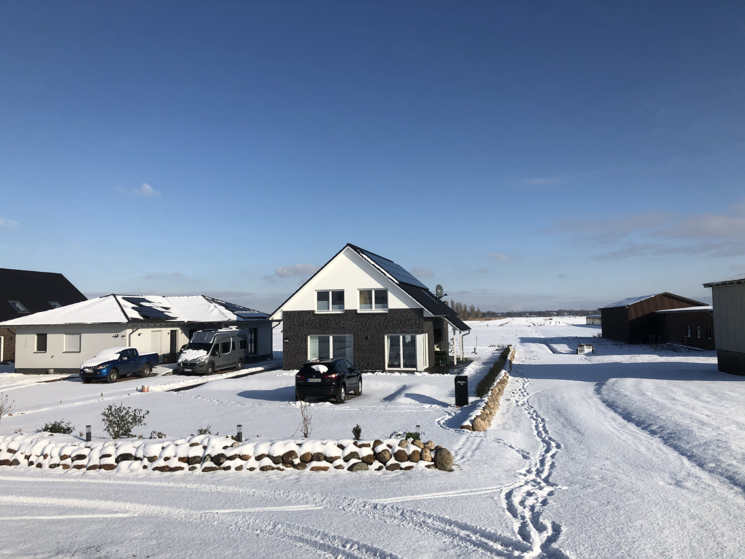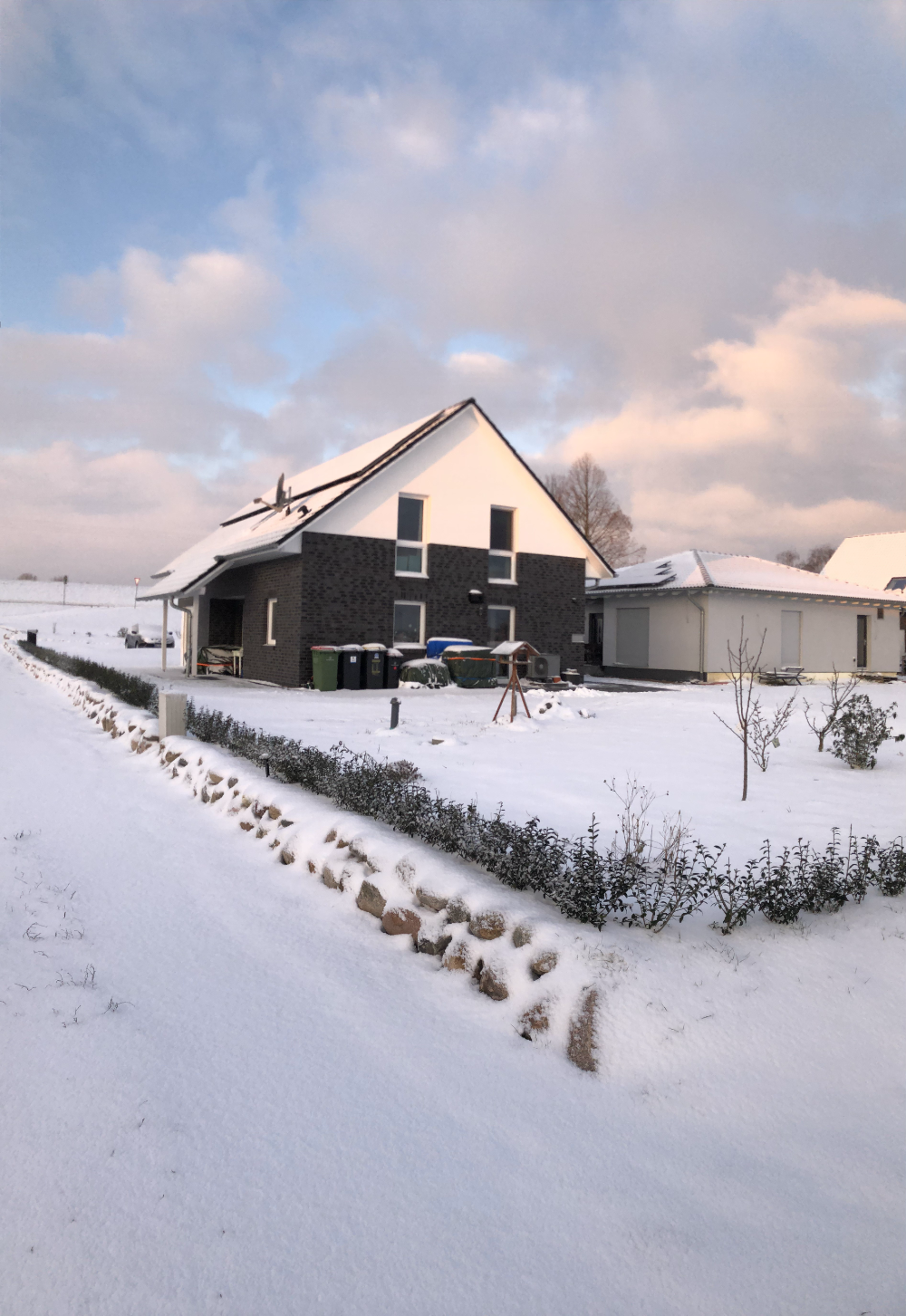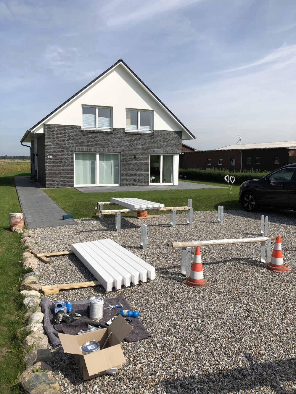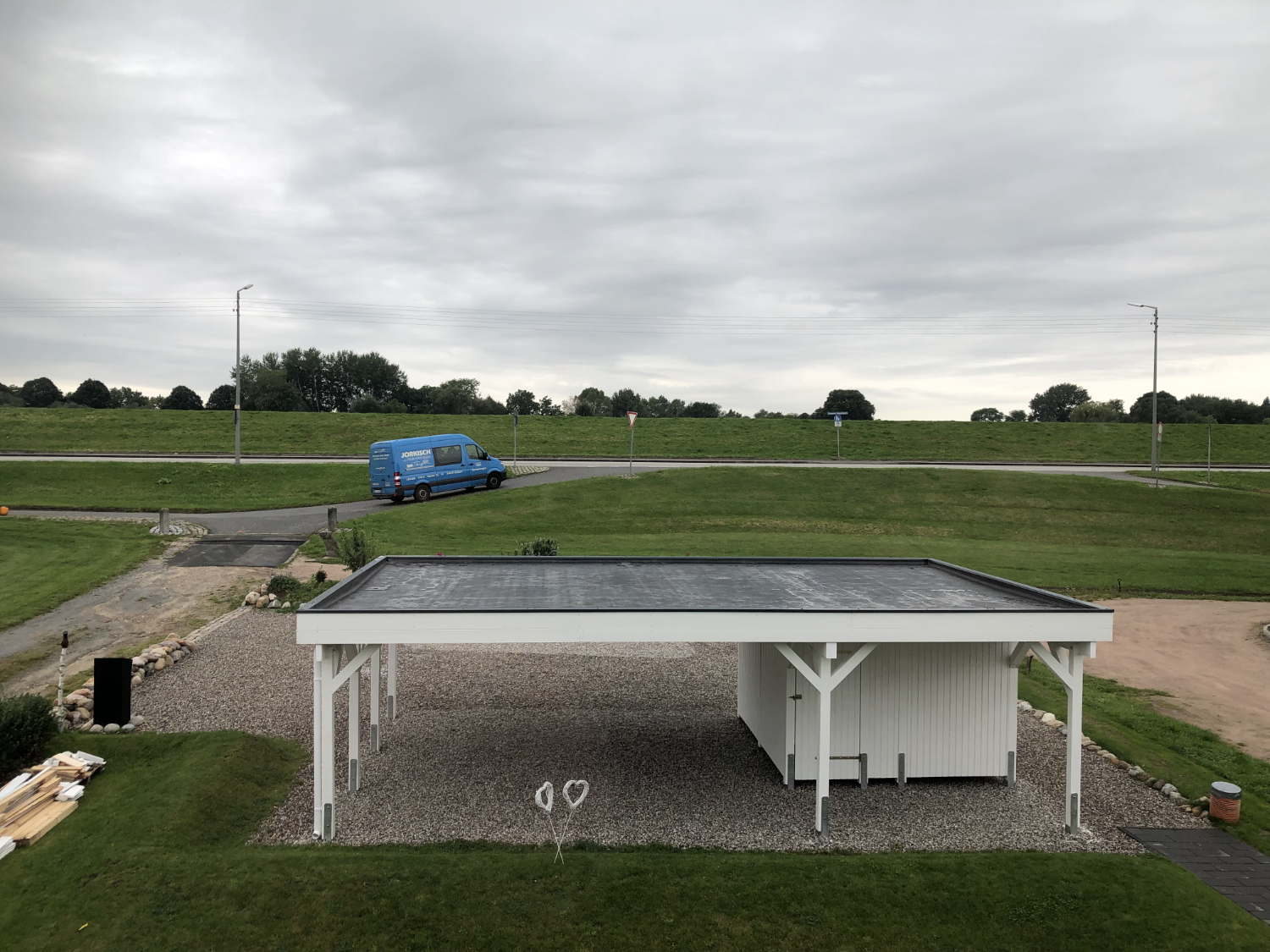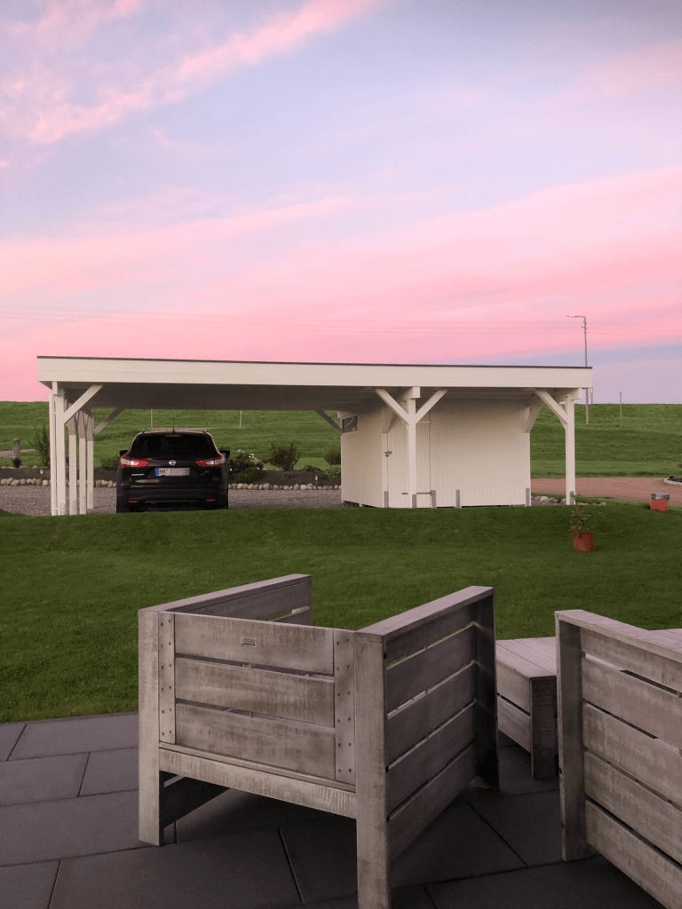 2021: Oops, it's actually been more than a year since our last blog entry. As the house has already been built, of course nothing has changed in the house itself, but a few things have changed around it. In January and February we were very happy to have completed the parking area in front of the house at the end of 2020 and to always be able to park our car on solid ground. Overall, the construction of the gravel stabilisers was a very good idea - especially when it rains there are no more puddles and everything stays dry. 2021 was a special year for us, as we got married civil and in church. In this respect, we didn't build anything around the house in March but forged our wedding rings - very close to us at the dike at Elbgold. The marriage took place in May and July. Newly married, of course, we went straight to the next project - that is, our carport. The foundation anchors for this were delivered in advance in July. Together with our neighbor Rainer, we then set 15 point foundations on our own. The carport itself should be set up by the Joda company from the start, so this was only a matter of preliminary work. At the same time as our foundation work, a fiber optic cable was finally laid at the dike. To connect our house to this network, the terrace behind the house had to be raised again to lay the fiber optic cable into the house connection box. We now expect the connection to the fiber optic network of Telekom at the beginning of 2022 - once they completet the whole network. The wood for the carport was delivered in September 2021 and we were able to start painting everything white before the fitters came to set up the carport. Since several coats (impregnation base / barrier primer / paint) were required, we were happy to have planned enough time for this. At the end of September, the carport, including the integrated shed, was set up within two days. In October we did some fine-tuning on the carport ourselves, i.e. additional cladding of the carport, adding the house number, interior fittings of the carport with device storage, etc. Since the company Joda found the result so beautiful, we now even have an entry on their company website. The last construction work on the property in November / December was the laying of the already provided power cable into the carport and as we will be installing a wallbox for our new electric car at the carport at the beginning of 2022, a LAN cable was quickly laid into the carport as well. You will read more about the connection between the photovoltaic system and the wallbox in the next blog entry in 2022.