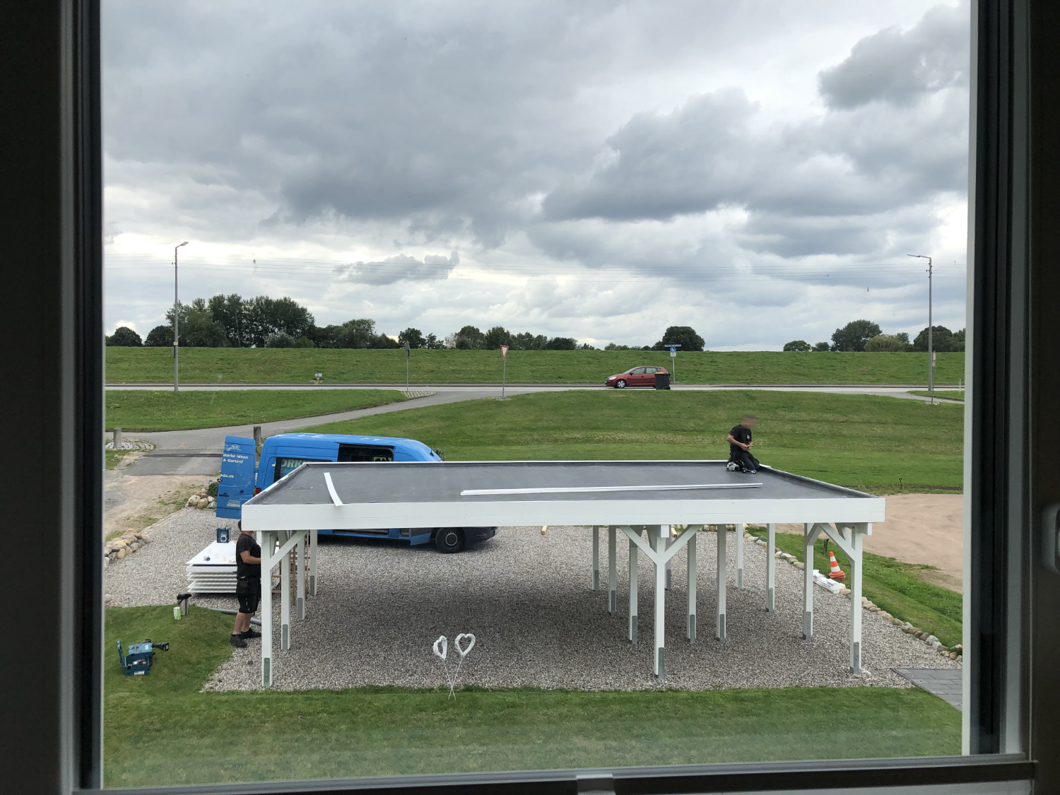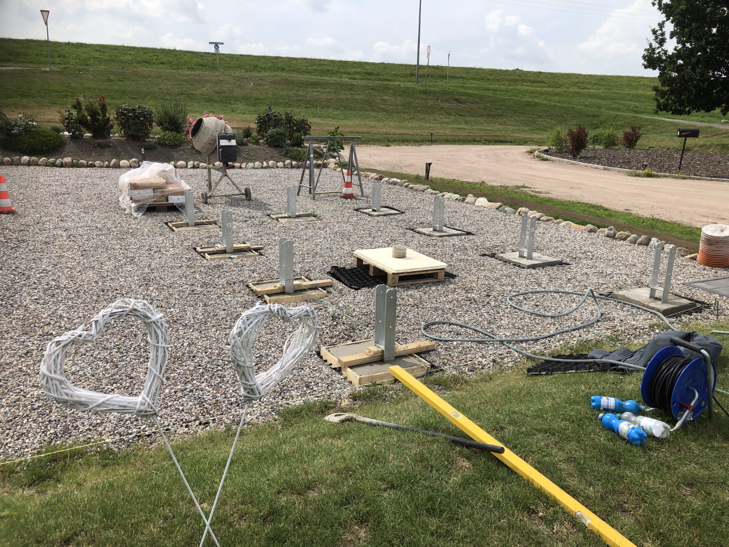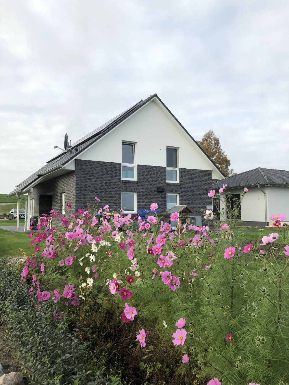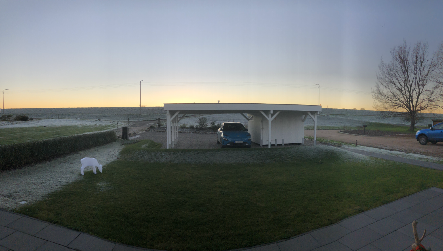 2021: Oops, it's actually been more than a year since our last blog entry. As the house has already been built, of course nothing has changed in the house itself, but a few things have changed around it. In January and February we were very happy to have completed the parking area in front of the house at the end of 2020 and to always be able to park our car on solid ground. Overall, the construction of the gravel stabilisers was a very good idea - especially when it rains there are no more puddles and everything stays dry. 2021 was a special year for us, as we got married civil and in church. In this respect, we didn't build anything around the house in March but forged our wedding rings - very close to us at the dike at Elbgold. The marriage took place in May and July. Newly married, of course, we went straight to the next project - that is, our carport. The foundation anchors for this were delivered in advance in July. Together with our neighbor Rainer, we then set 15 point foundations on our own. The carport itself should be set up by the Joda company from the start, so this was only a matter of preliminary work. At the same time as our foundation work, a fiber optic cable was finally laid at the dike. To connect our house to this network, the terrace behind the house had to be raised again to lay the fiber optic cable into the house connection box. We now expect the connection to the fiber optic network of Telekom at the beginning of 2022 - once they completet the whole network. The wood for the carport was delivered in September 2021 and we were able to start painting everything white before the fitters came to set up the carport. Since several coats (impregnation base / barrier primer / paint) were required, we were happy to have planned enough time for this. At the end of September, the carport, including the integrated shed, was set up within two days. In October we did some fine-tuning on the carport ourselves, i.e. additional cladding of the carport, adding the house number, interior fittings of the carport with device storage, etc. Since the company Joda found the result so beautiful, we now even have an entry on their company website. The last construction work on the property in November / December was the laying of the already provided power cable into the carport and as we will be installing a wallbox for our new electric car at the carport at the beginning of 2022, a LAN cable was quickly laid into the carport as well. You will read more about the connection between the photovoltaic system and the wallbox in the next blog entry in 2022.