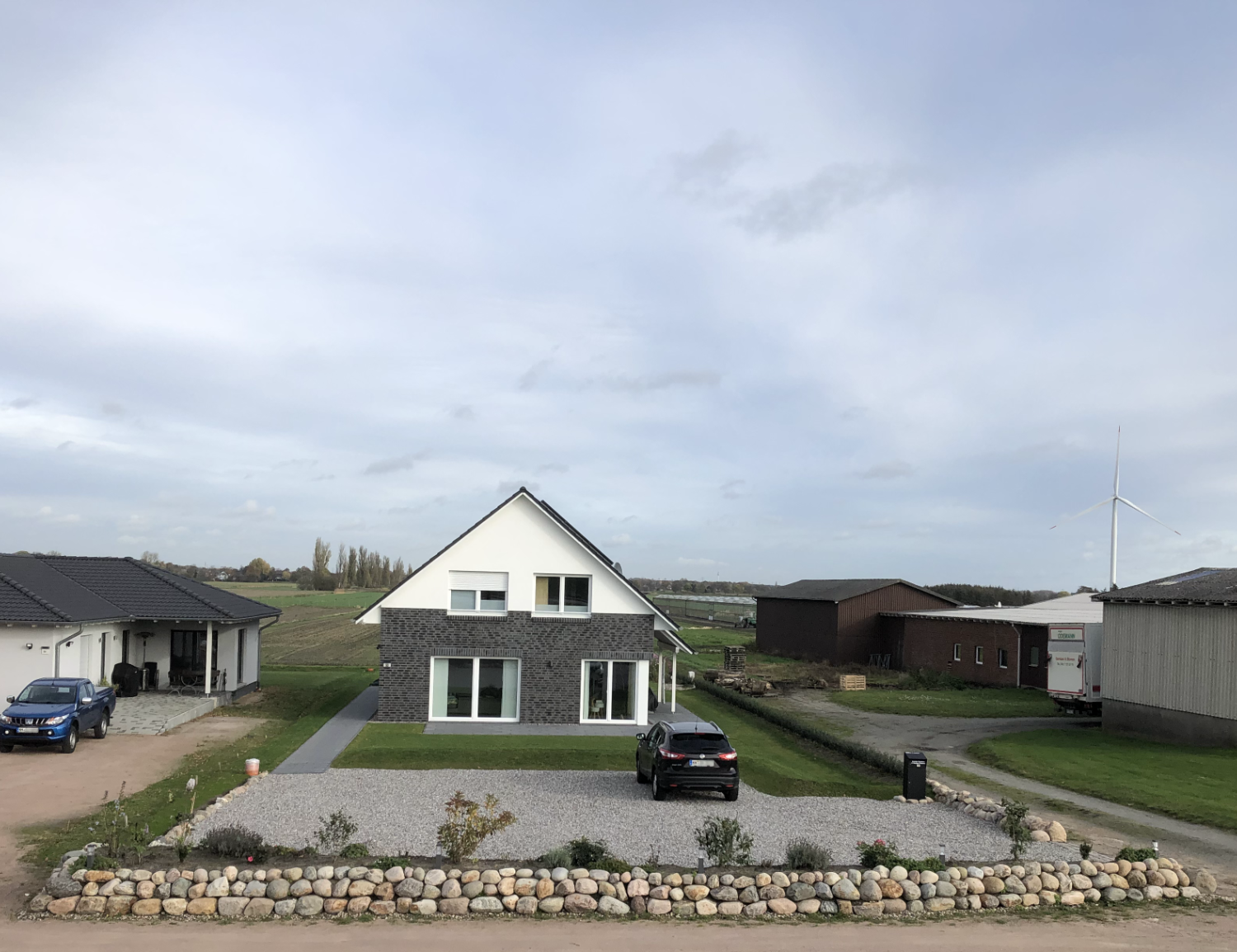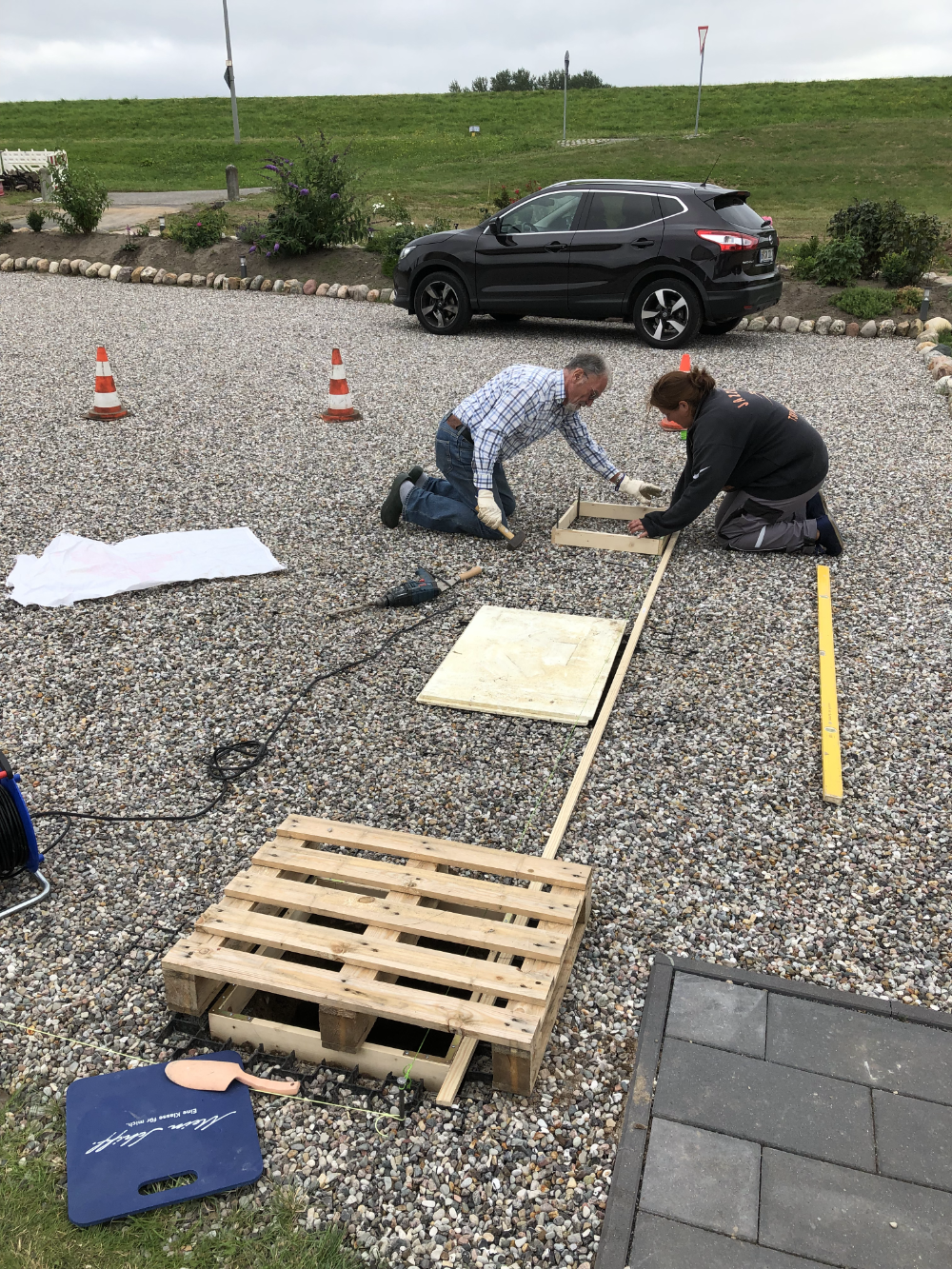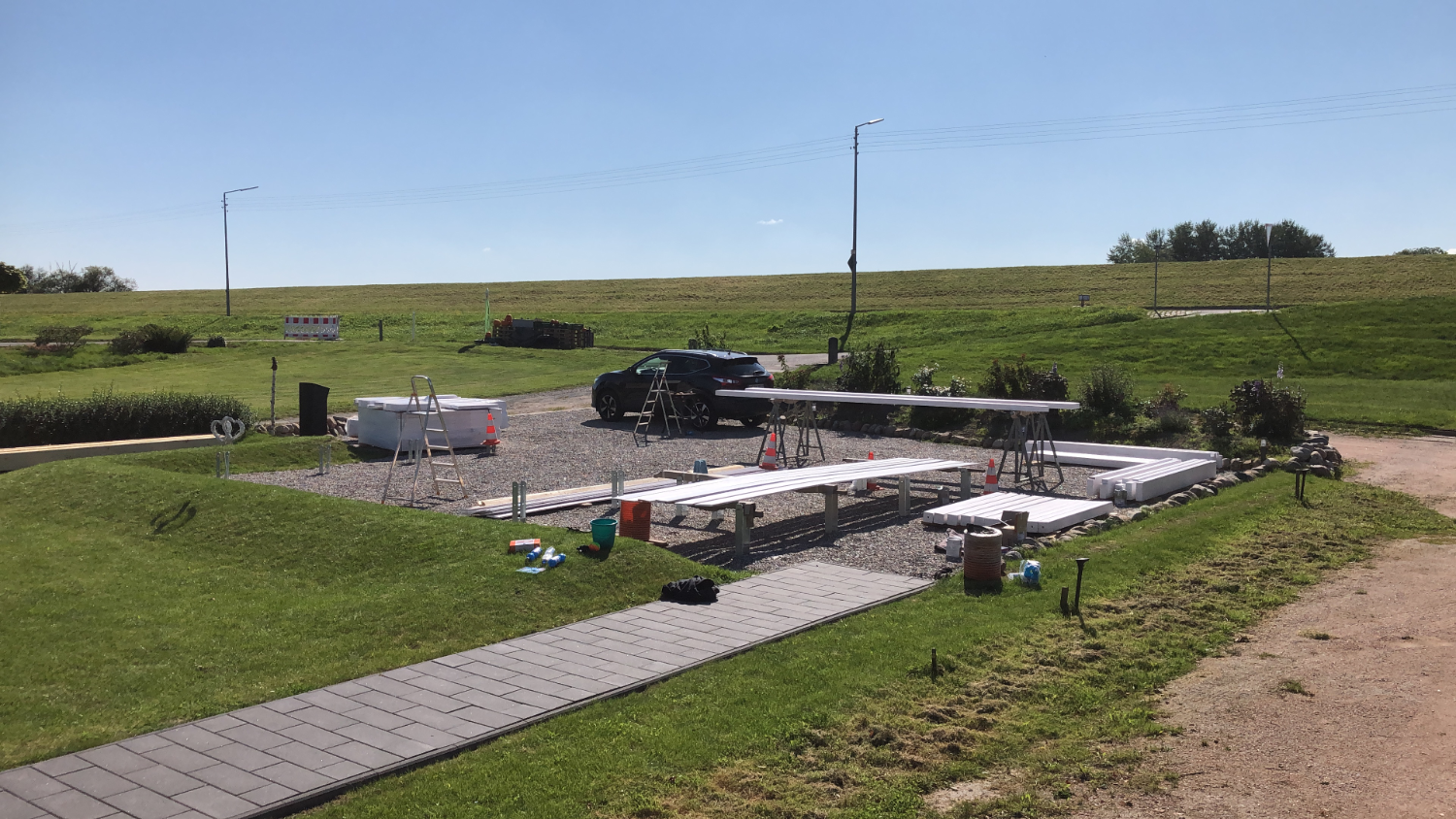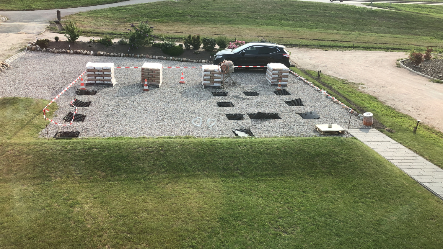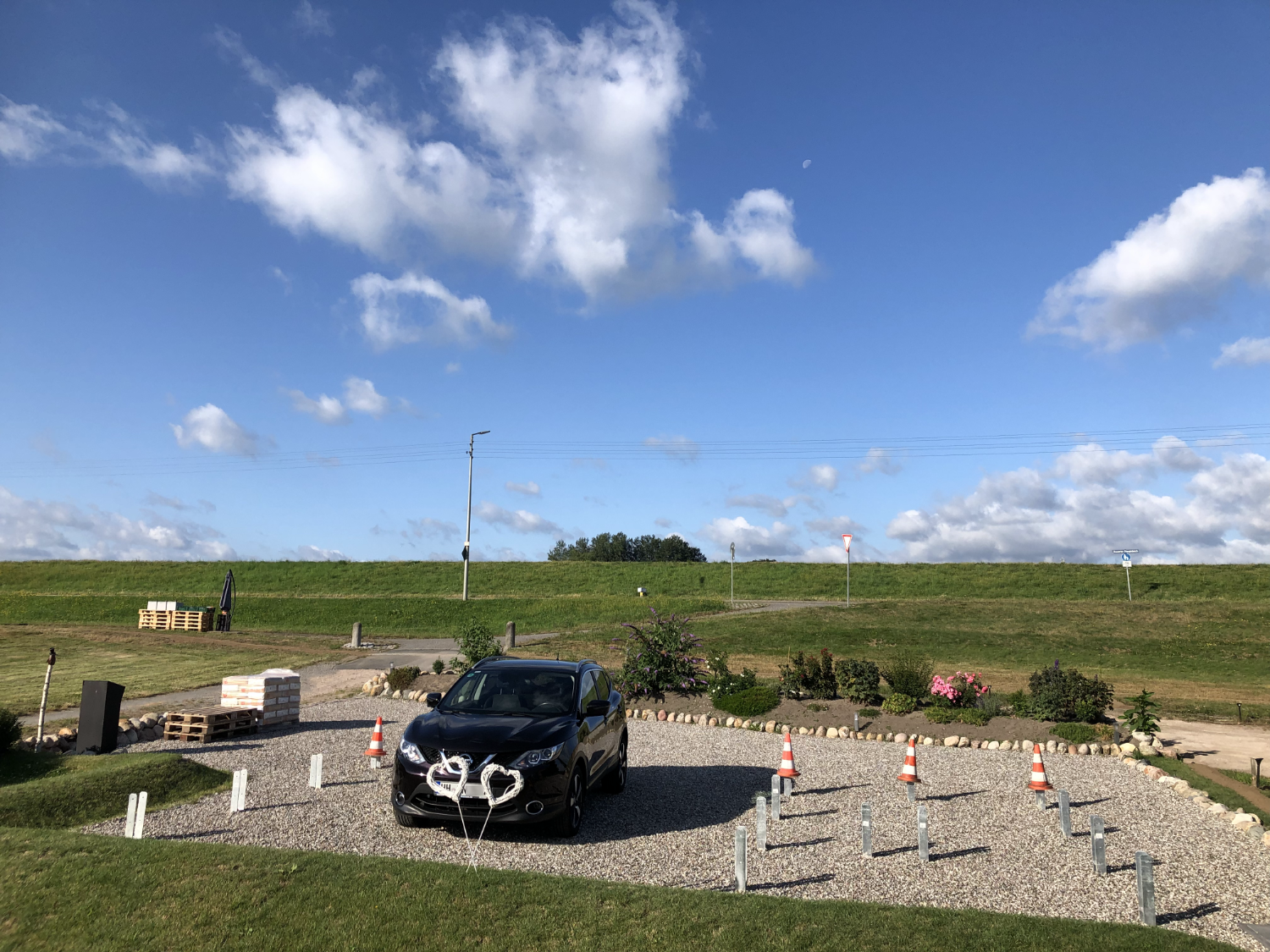 2021: Oops, it's actually been more than a year since our last blog entry. As the house has already been built, of course nothing has changed in the house itself, but a few things have changed around it. In January and February we were very happy to have completed the parking area in front of the house at the end of 2020 and to always be able to park our car on solid ground. Overall, the construction of the gravel stabilisers was a very good idea - especially when it rains there are no more puddles and everything stays dry. 2021 was a special year for us, as we got married civil and in church. In this respect, we didn't build anything around the house in March but forged our wedding rings - very close to us at the dike at Elbgold. The marriage took place in May and July. Newly married, of course, we went straight to the next project - that is, our carport. The foundation anchors for this were delivered in advance in July. Together with our neighbor Rainer, we then set 15 point foundations on our own. The carport itself should be set up by the Joda company from the start, so this was only a matter of preliminary work. At the same time as our foundation work, a fiber optic cable was finally laid at the dike. To connect our house to this network, the terrace behind the house had to be raised again to lay the fiber optic cable into the house connection box. We now expect the connection to the fiber optic network of Telekom at the beginning of 2022 - once they completet the whole network. The wood for the carport was delivered in September 2021 and we were able to start painting everything white before the fitters came to set up the carport. Since several coats (impregnation base / barrier primer / paint) were required, we were happy to have planned enough time for this. At the end of September, the carport, including the integrated shed, was set up within two days. In October we did some fine-tuning on the carport ourselves, i.e. additional cladding of the carport, adding the house number, interior fittings of the carport with device storage, etc. Since the company Joda found the result so beautiful, we now even have an entry on their company website. The last construction work on the property in November / December was the laying of the already provided power cable into the carport and as we will be installing a wallbox for our new electric car at the carport at the beginning of 2022, a LAN cable was quickly laid into the carport as well. You will read more about the connection between the photovoltaic system and the wallbox in the next blog entry in 2022.